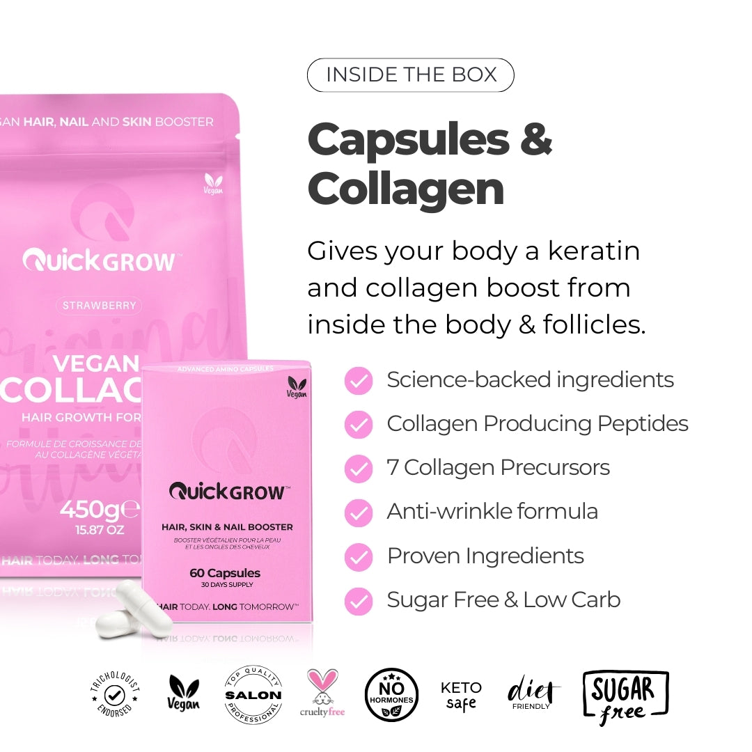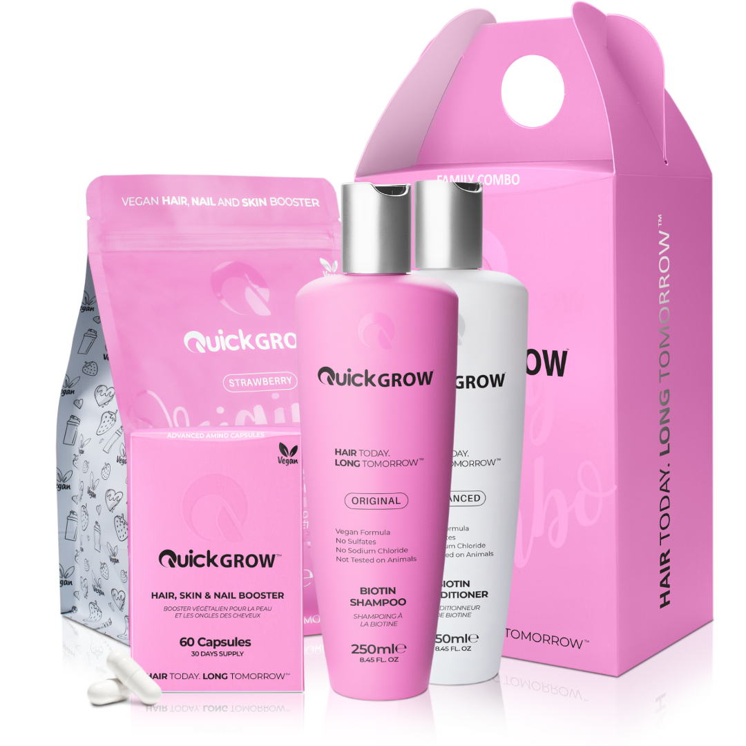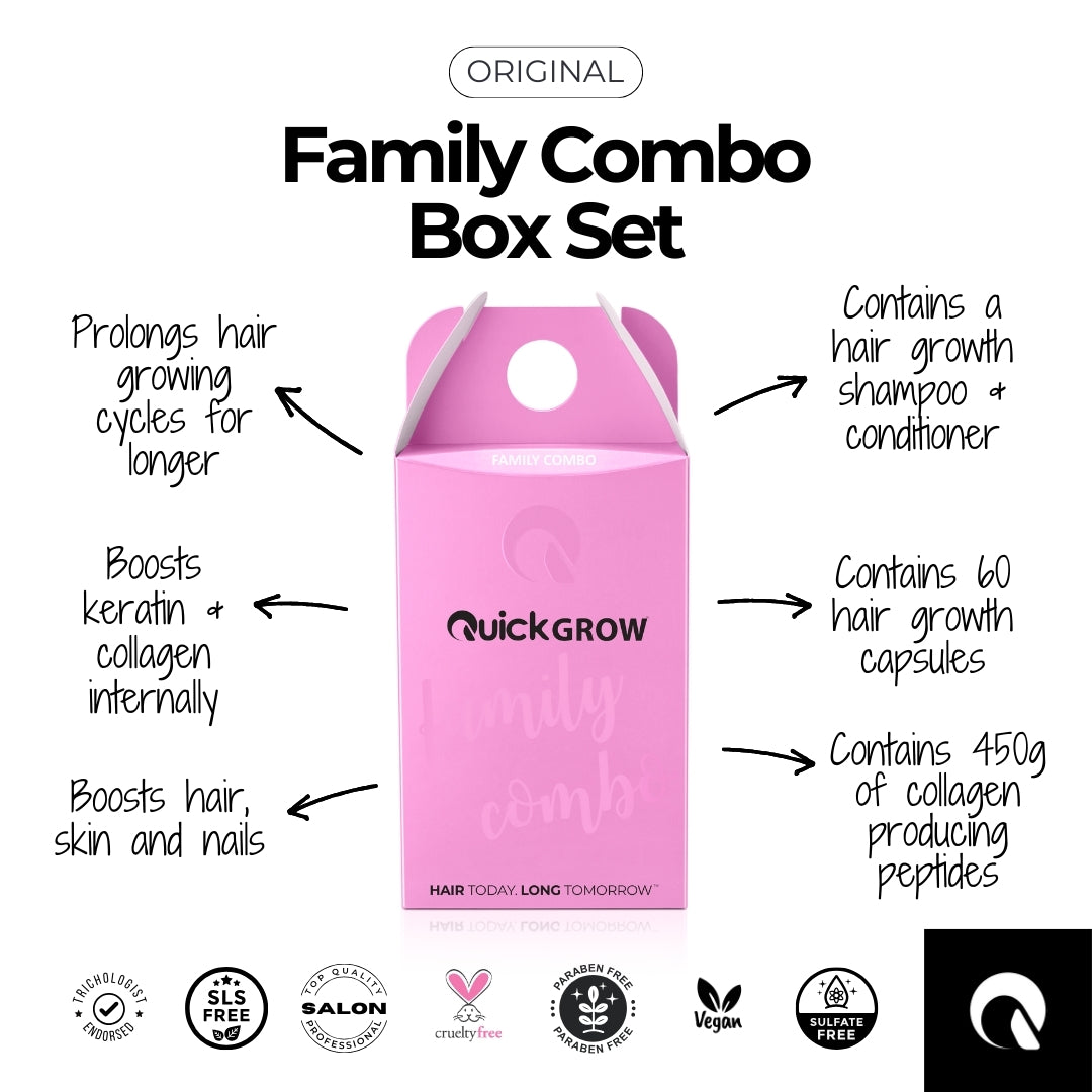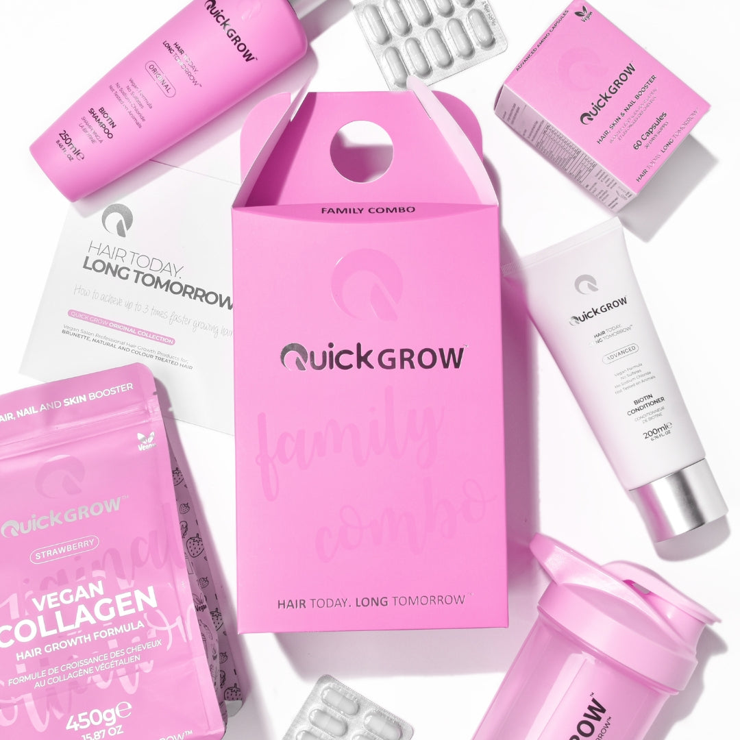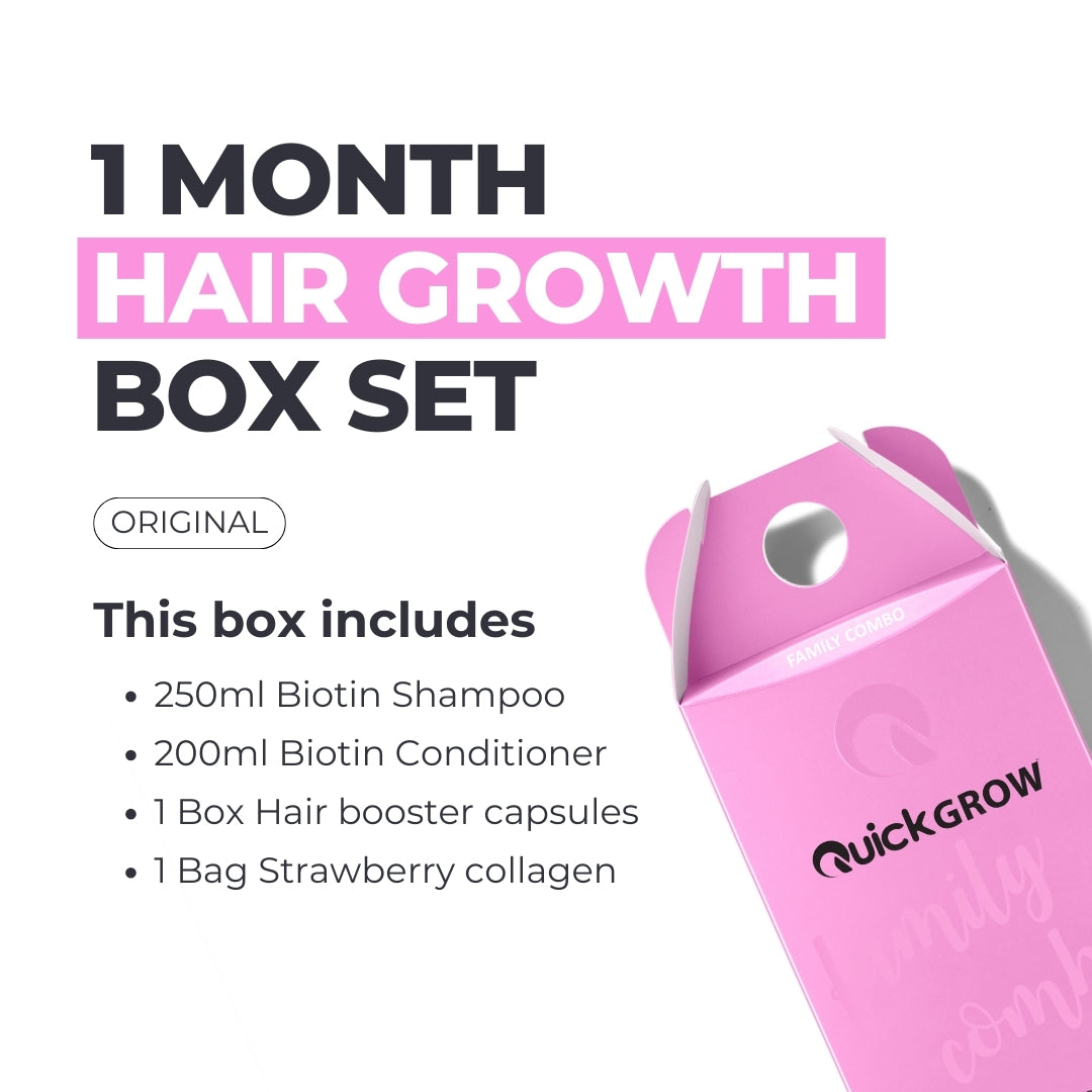 Treat your hair to a month's supply of hair growth goodness with our Original Family Combo for natural & colour treated hair. Start your day with 2 hair growth capsules, enjoy our yummy guilt-free strawberry collagen in the afternoon and wash your hair every 2 - 3 days with our deliciously fragranced pink apple scented hair growth shampoo and conditioner. Get ready to say "hello" to your longer, faster growing hair!