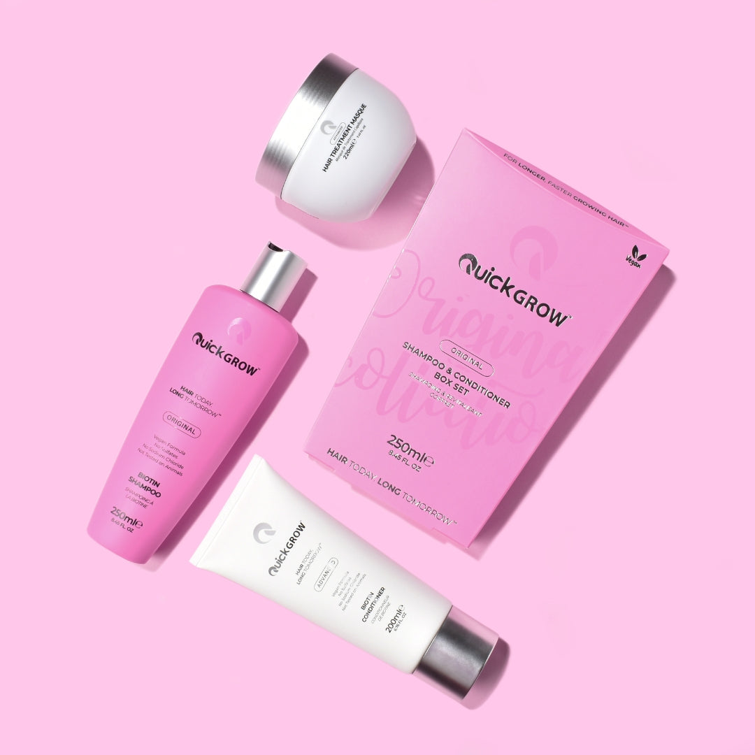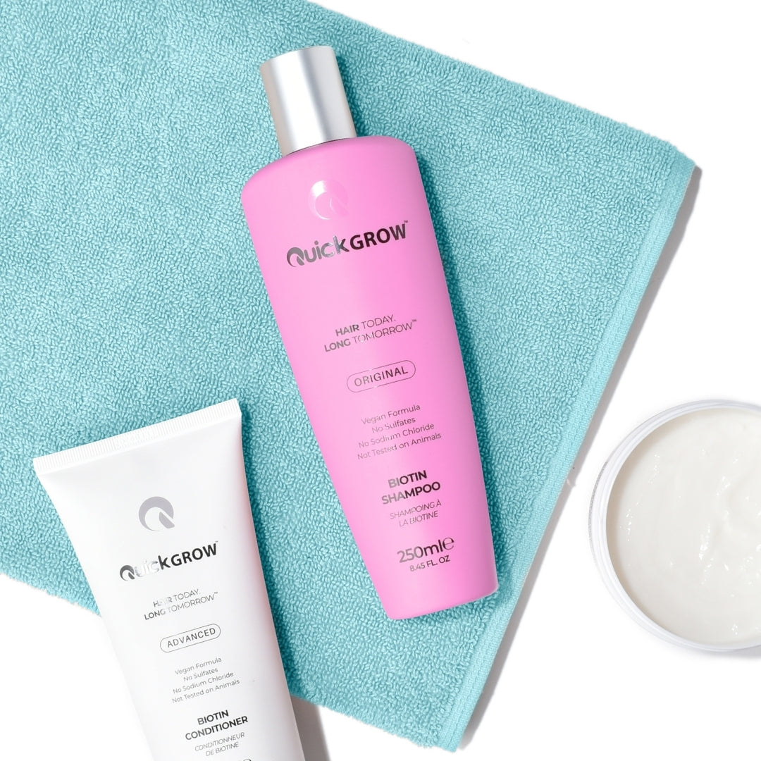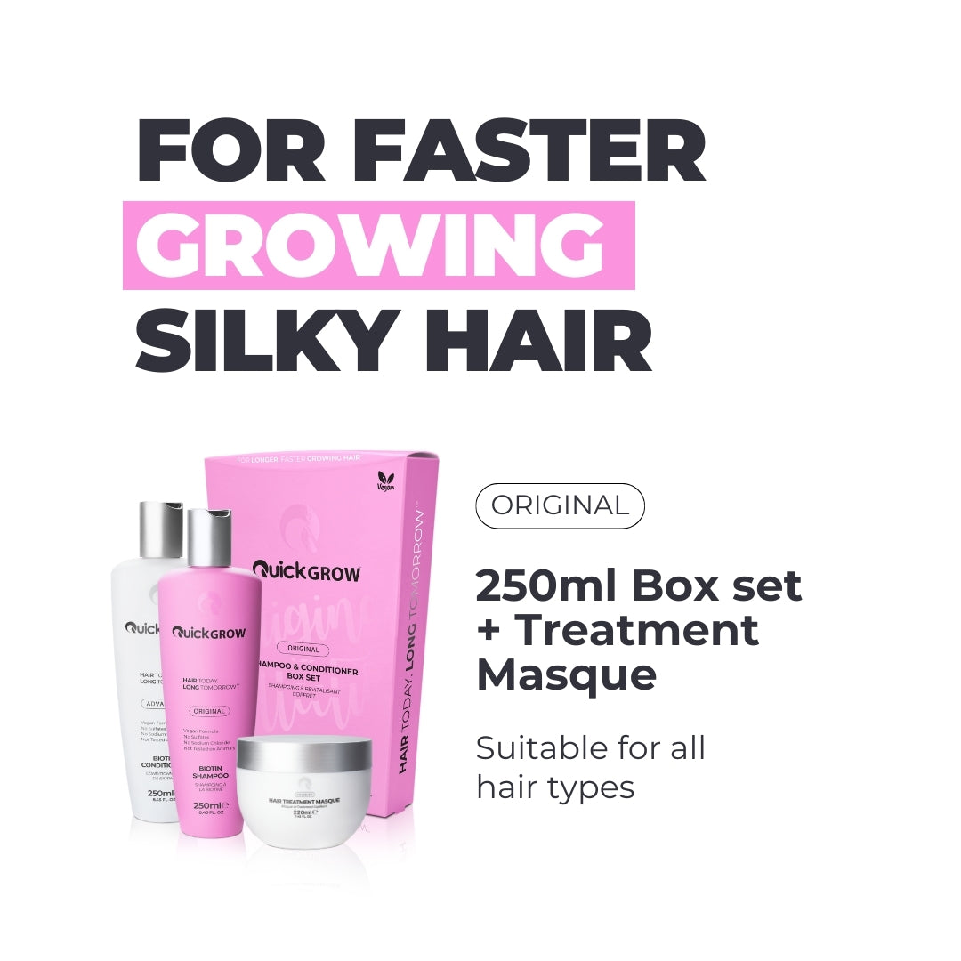 Ready to elevate your hair game? Meet our Quick Grow Shampoo, Conditioner, and Hair Masque Bundle—your all-in-one solution for faster hair growth, improved density, boosted shine, and luxurious softness. These 3 products work together to encourage more hairs into a healthy growing cycle, and intensely hydrate and treat your hair from the inside out after every wash.